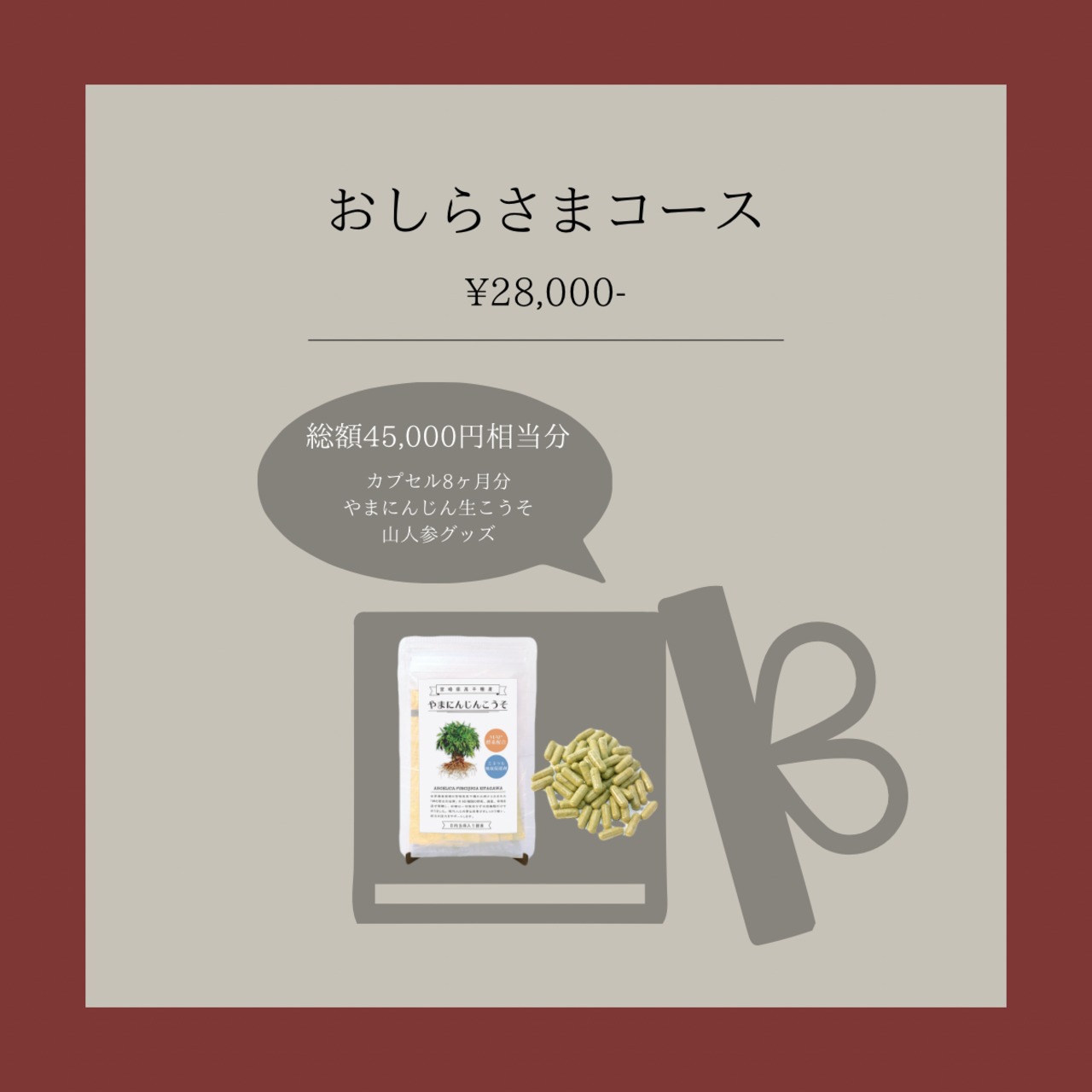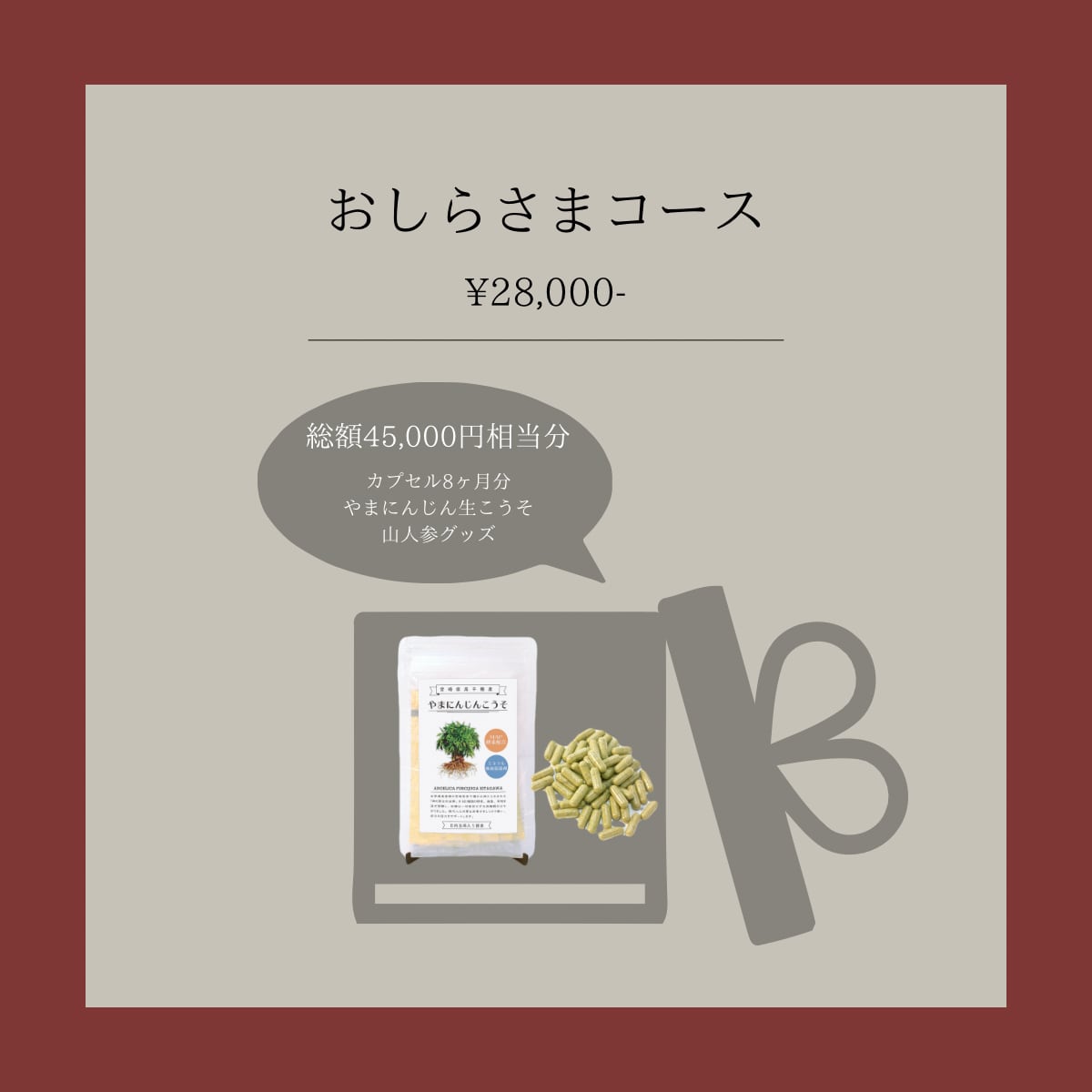 自分自身を大切に労わり、心身のバランスを整えたい方のためのコースです。 季節の変わり目や、気温の変化に負けない「揺るがない土台」を作ります。日本山人参が体に優しく浸透し、あなたを内側から優しく守るバリアとなって、毎日を穏やかに過ごすお手伝いをします。